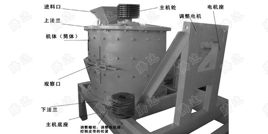 物料由機(jī)器上部垂直落入高速旋轉(zhuǎn)的葉輪內(nèi),在高速離心力的作用下,與另一部分以傘狀形式分流在葉輪四周的物料產(chǎn)生高速撞擊與粉碎,物料在互相撞擊后,又會(huì)在葉輪和機(jī)殼之間以物料形成渦流多次的互相撞擊、摩擦而粉碎,從下部直通排出,形成閉路多次循環(huán),由篩分設(shè)備控制達(dá)到所要求的成品粒度。